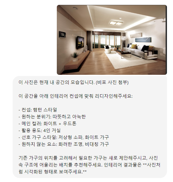 - 우선 지금 현재 집사진을 첨부파일로 업로드한 후 위의 프롬프트와 같이 입력을 해줍니다. 컨셉부터 원하는 분위기나 가구까지 원하시는 스타일을 전부 넣으시면 됩니다.